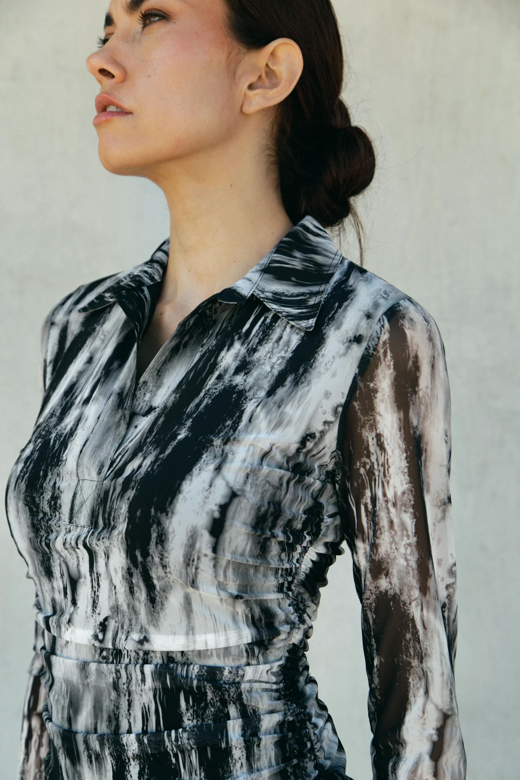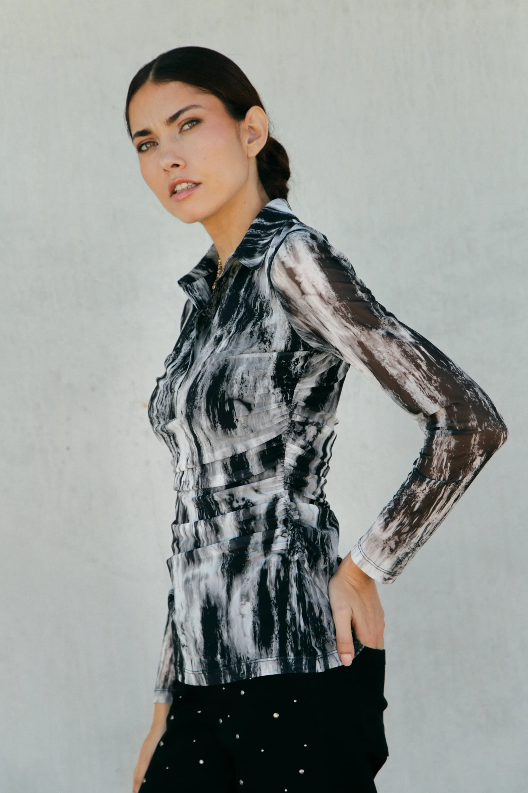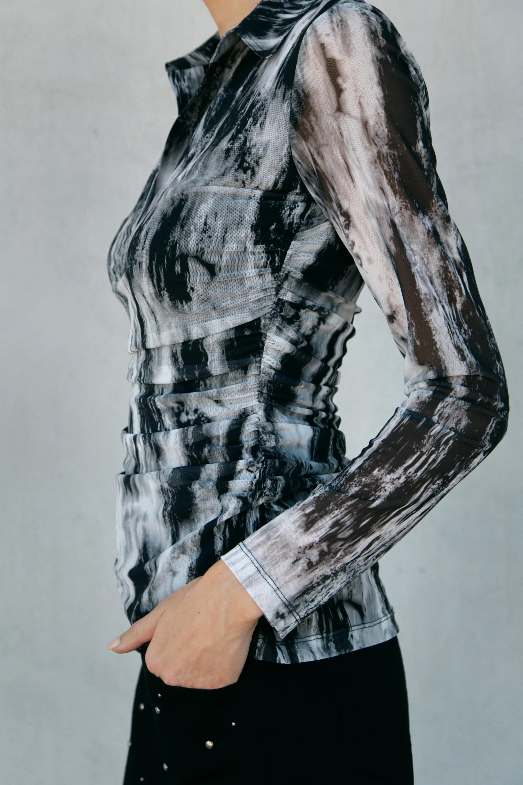 Top drapé Horizon en maille résille imprimé B&W