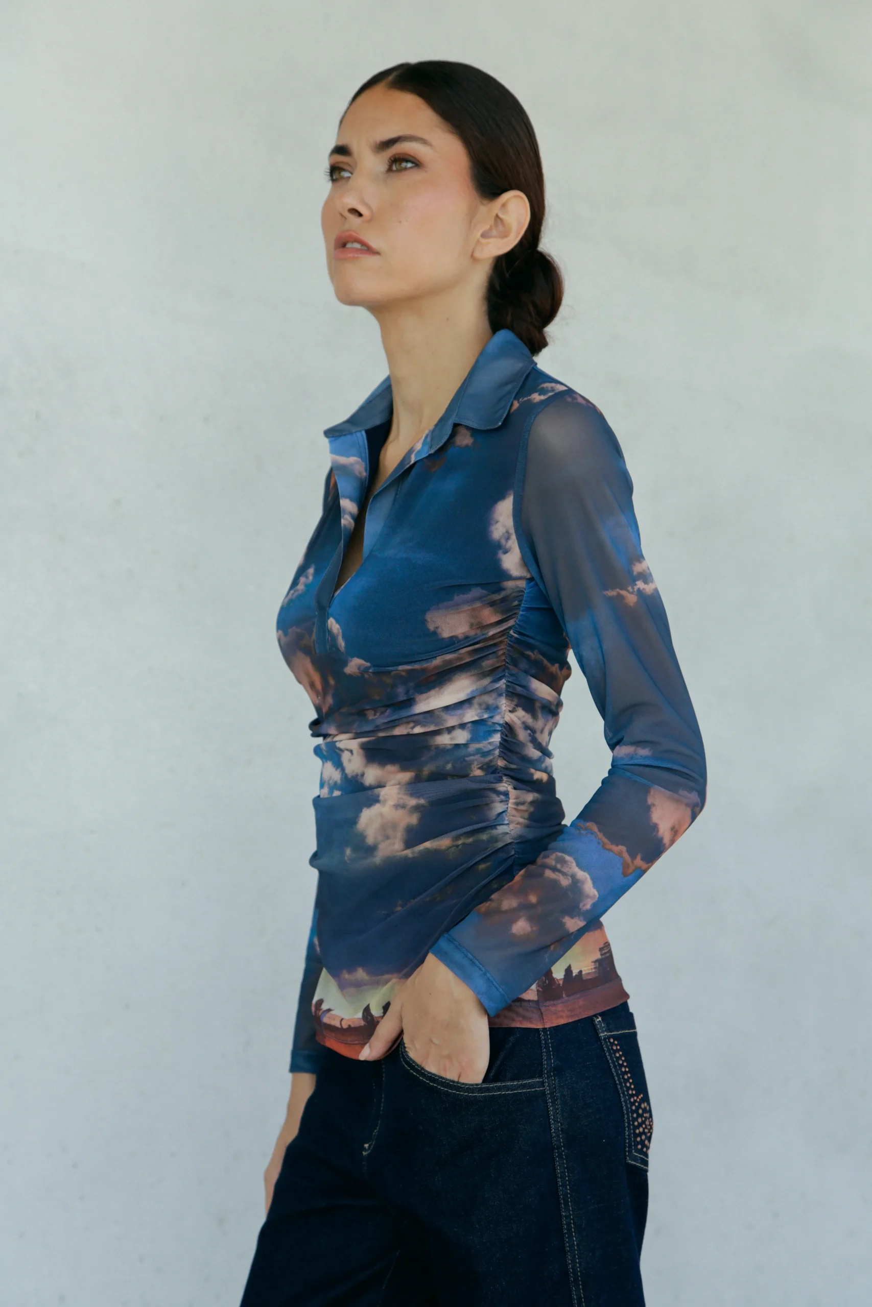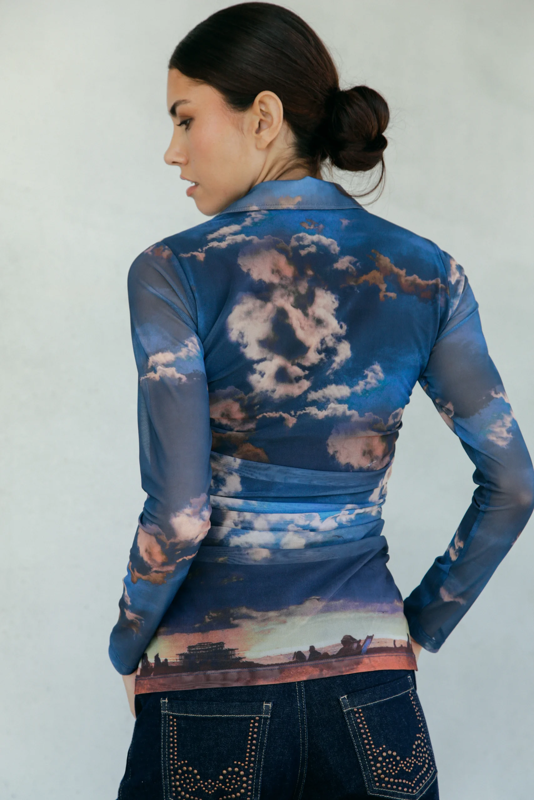 Le top Horizon capture l’esprit de liberté avec son imprimé nuage poétique. Confectionné en maille résille à la fois chic et confortable, il associe modernité et douceur.