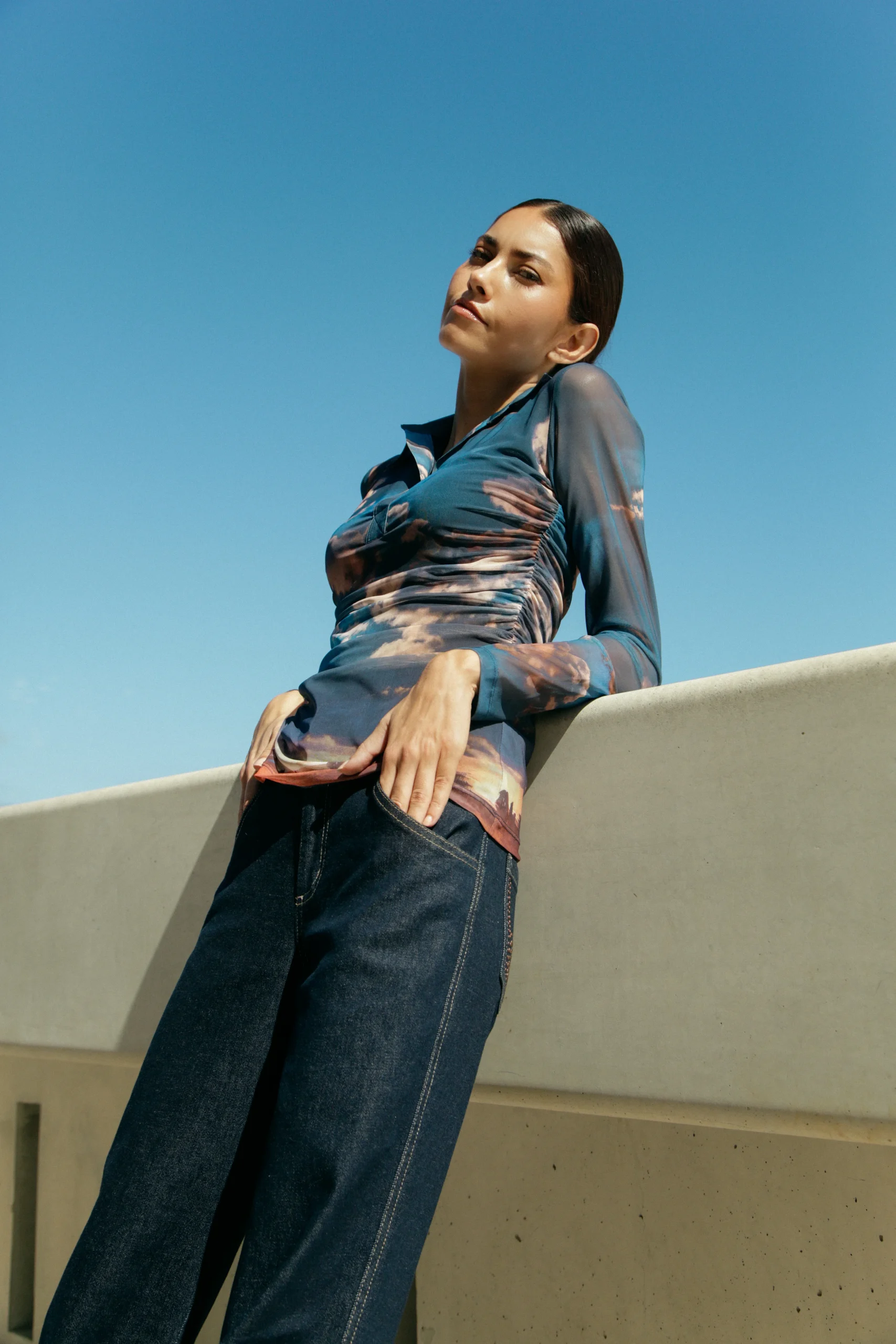 Drapés élégants qui valorisent la silhouette. Légère transparence et jeu de doublure. Maille résille stretch pour un tombé harmonieux qui s’adapte à toutes les morphologies. Col chemise structuré. Le top Horizon capture l’esprit de liberté avec son imprimé nuage poétique. Confectionné en maille résille à la fois chic et confortable, il associe modernité et douceur. […]