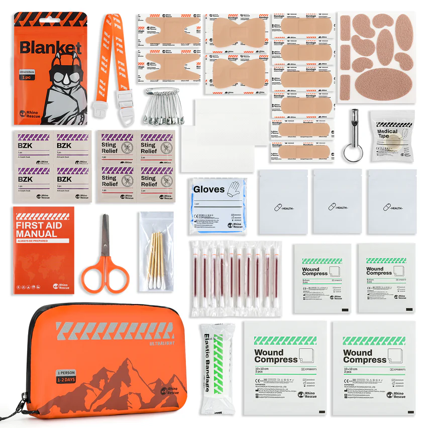 Trousse de secours ULTRALIGHT Rhino Rescue : kit compact et ultra léger avec 79 éléments essentiels. Idéal outdoor, randonnée et EDC.