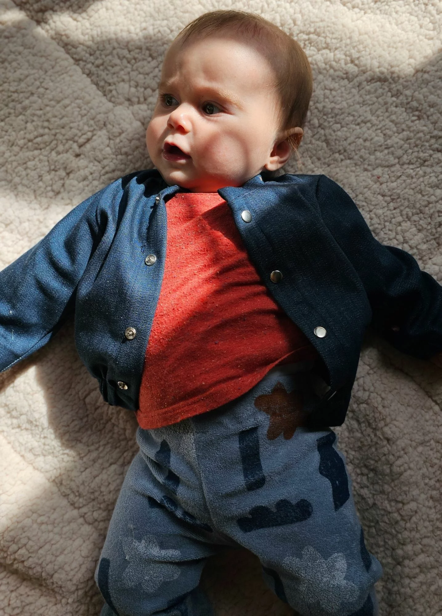 Cette veste en jean pour bébé et enfant, disponible du 3 mois au 6 ans, est conçue en tissu recyclé et fabriquée en France avec un savoir-faire local.